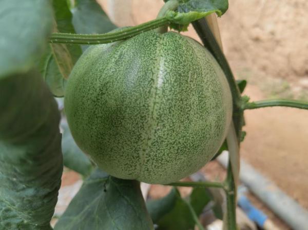 “除了‘绿宝’甜瓜,今年还试种了‘玉菇’,‘玉菇’比‘绿宝’个头大,是从台湾引进的,皮厚糖度高,香气浓郁,肉质鲜脆,收购价比‘绿宝’高,外皮是白的。”谈话间,李海军摘下一个成熟的“玉菇”甜瓜。