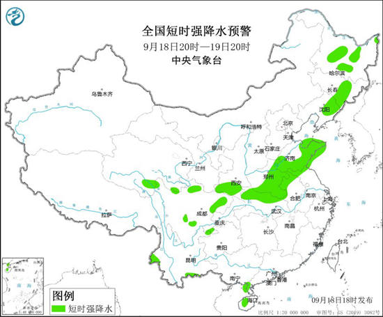 预计9月18日20时至19日20时,辽宁中东部、吉林中东部、黑龙江南部以及河南南部、山东东北部和南部、安徽西北部、湖北北部等地的部分地区将有8-10级雷暴大风或冰雹天气,其中辽宁中东部、吉林中东部、黑龙江南部等地局地风力可达11-12级;黑龙江中东部、吉林东部、辽宁中东部、陕西南部、山东东部和南部、河南东部和南部、安徽北部、江苏北部、湖北北部、四川北部和东部、云南南部等地的部分地区将有短时强降水天气,最大小时雨量30-50毫米,局地可达60毫米以上。