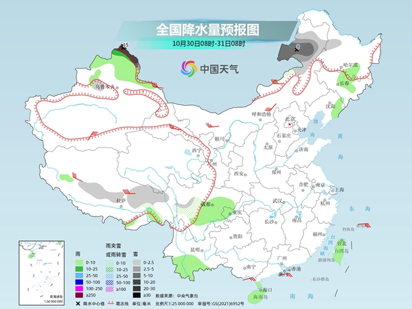 根据中央气象台预报,今天,新疆阿勒泰地区、内蒙古东北部、西藏东部、川西高原南部等地部分地区有小到中雪,其中,新疆阿勒泰北部、内蒙古东北部等地局部地区有大雪或暴雪。黑龙江东南部、吉林中东部、辽宁东部、四川东南部、云南南部、海南岛、台湾岛等地部分地区有小雨。