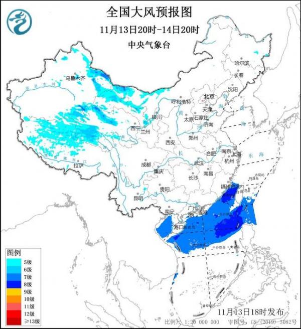 预计,11月13日20时至14日20时,台湾海峡、台湾以东洋面、巴士海峡、南海北部和中部海域、北部湾将有7~8级、阵风9~10级的大风。新疆东部和南疆盆地南部、西藏北部、内蒙古西部、甘肃北部、青海西部、海南岛、台湾岛等地部分地区将有5~6级、阵风7~8级的大风。