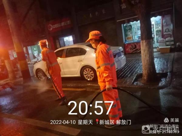 4月10日晚,解放门街道对辖区开展污染扬尘防治工作,持之以恒降低辖区扬尘污染。
